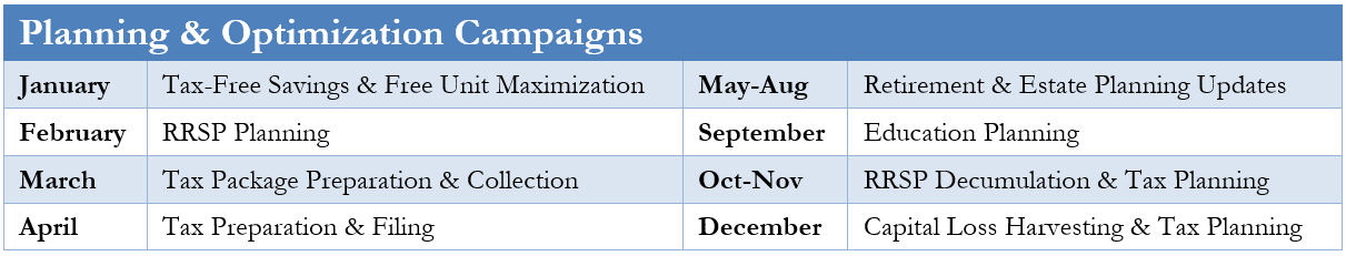 Specifically, we will continue our transition toward business-wide planning campaigns, targeting one aspect of your profile per year and leveraging our team members to ensure that everyone’s planning needs are being met.