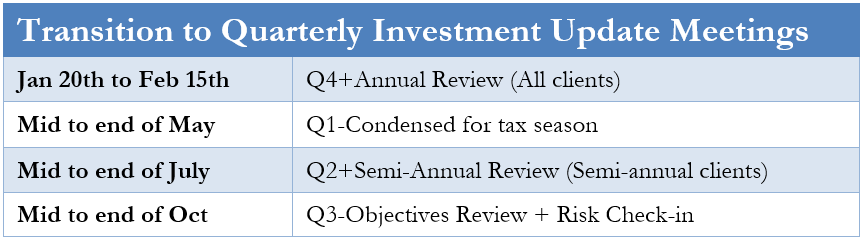 To further improve on the quality and depth of our in-person client communication, we will be transitioning our investment update meetings to a more formalized quarterly, semi-annual, and annual schedule. Doing so will allow advisors to prepare a more in-depth analysis for clients and improve our ability to remain focused on the management of those dollars outside of these periods.