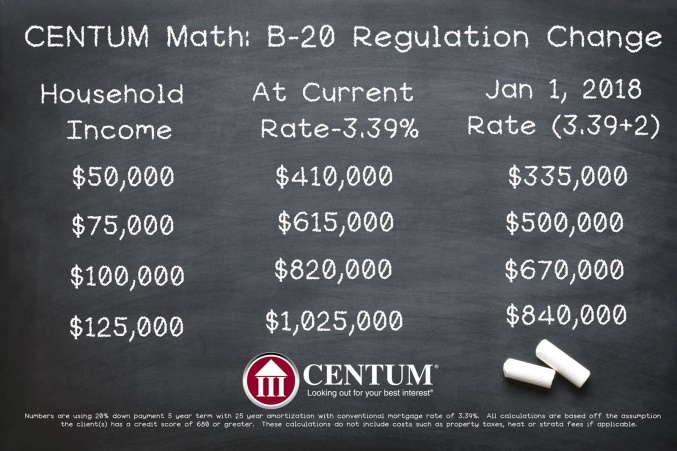 All borrowers will have to pass a financial stress-test to determine if their ability to withstand rising interest rates on their new mortgage. The stress-test is designed to ensure that mortgagors can still afford to pay their mortgage should rates increase 2% higher than current rates. In other words, if you can’t afford your mortgage at 4.89% (current market mortgage rate plus 2%), then you won’t qualify for a mortgage under the new guidelines.